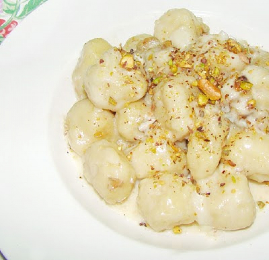Gnocchi di patate gratinati con provola, noci e pistacchio di Bronte