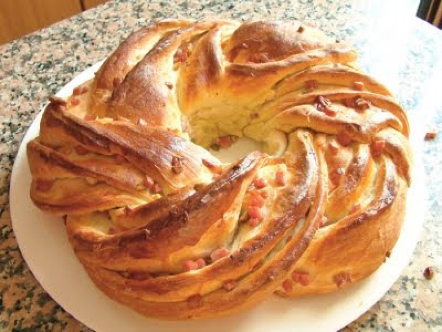 Tappa 5: Arrotolate il lato più lungo della sfoglia, trasferite il rotolo su un foglio di carta da forno e tagliatelo a metà per il lungo, aiutandovi con un coltello unto. Girate i due pezzi con il lato tagliato verso l'alto e formate una treccia facendo in modo che la parte tagliata sia rivolta sempre verso l'alto.